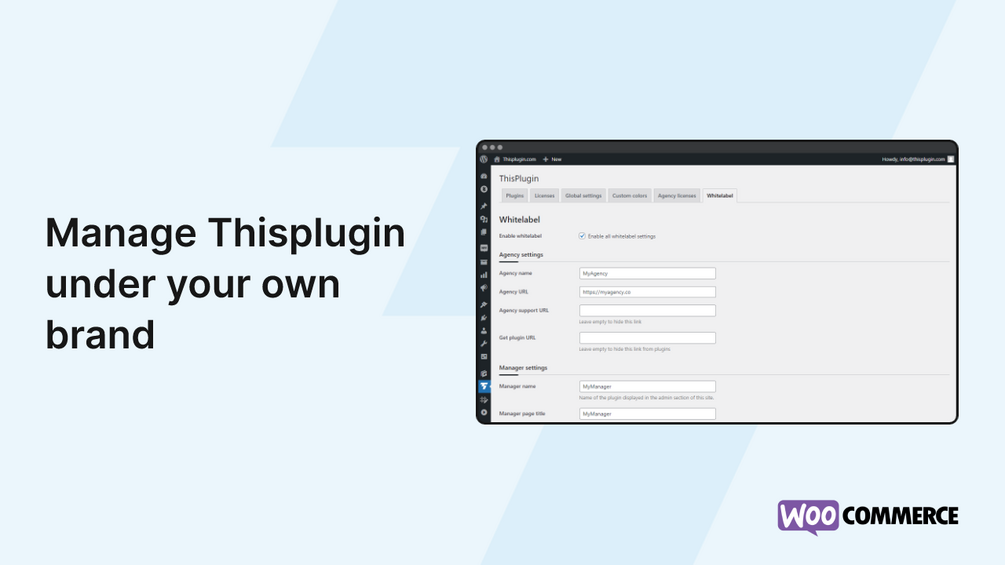 Set your own branding – change the icon, accent color, plugin name and description, display options, plugin list management.